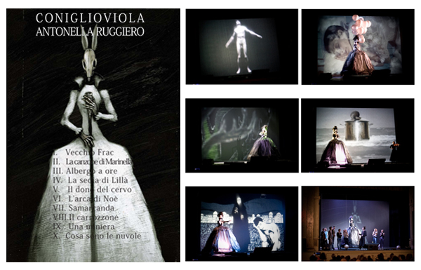 Per fare questo ci sono tecnologie pioneristiche come l’olografia ma anche dell’utilizzo contemporaneo di molteplici piani di proiezione: il fondale del palcoscenico, la gonna-installazione di Antonella Ruggiero (che illuminandosi dall’interno si trasforma in una sorta di abat-jour) e il grappolo di palloncini che Antonella porta in scena. In scena, dentro un altro artificio, non digitale ma di antica tradizione, il black light theatre, che richiama le fantasmagorie della morte, suona nel buio un quartetto di archi elettrici, gli strumenti che più ricordano la forma del corpo umano, svuotati però della corporeità, e un pianoforte a coda, che aprendosi assume le sembianze di una grande bara. E poi la voce più immateriale della musica italiana, la magia di Antonella Ruggiero che, sospesa su una gonna-installazione alta tre metri e muovendosi esclusivamente su dei binari, traghetta gli spettatori dall’uno all’altro mondo.